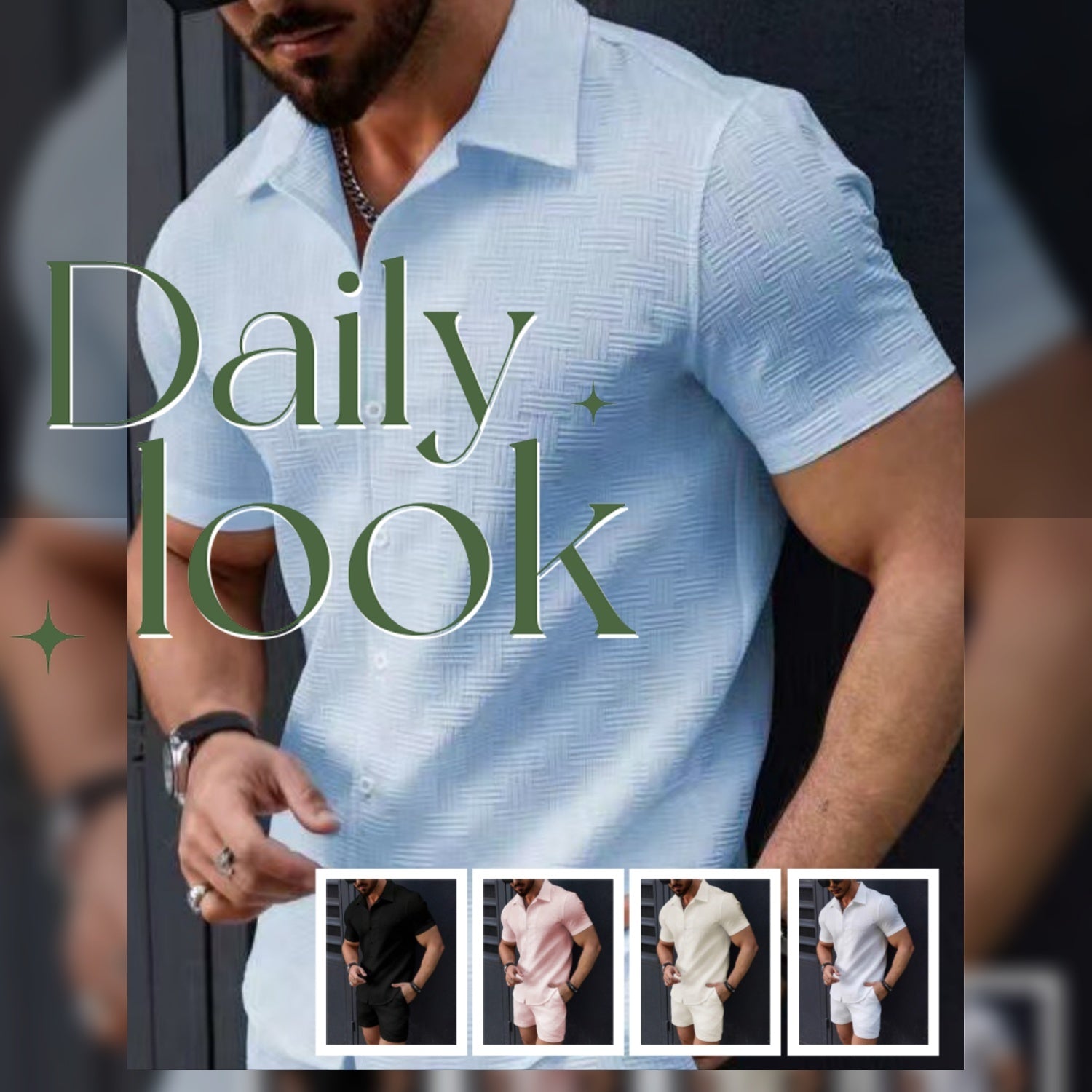 Leisure Breathable Beach Two Piece Suits Mens Summer Casual Short Sleeve Shirt And Shorts Men Outfits Vintage Textured Solid Set