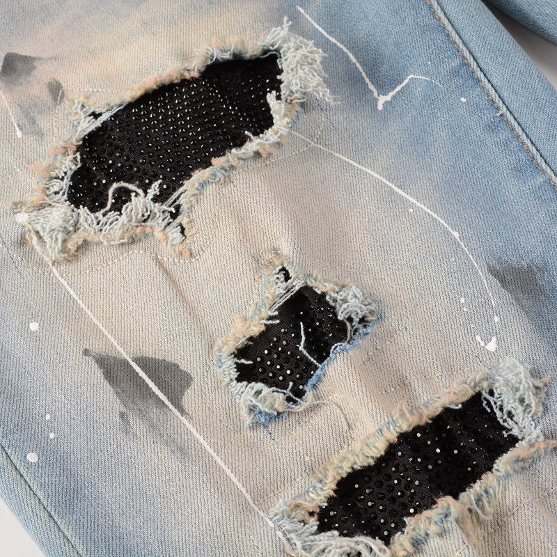 Rhinestone Patch Slim Fit Straight Ripped High Street Jeans